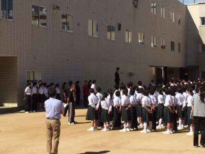 全校集会がありました。初めに、大阪市春季総合体育大会で優勝した、女子ソフトボール部の表彰がありました。そのあと、校長先生から「春季総体のすべての会場で、選手・応援・運営の熱いがんばりを見ることができました。日頃のみなさんの活動の成果だと思います。特に、優勝した女子ソフトボール部のみなさんおめでとうございます。」「明日6月6日は本校の創立記念日で、創立70年目を迎えます。6月6日は西淀中学校という校名になった日です。」というお話がありました。