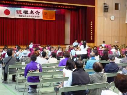 9月18日(月)敬老の日の午後、姫里小学校で姫里地域の敬老会が開催されました。敬老会第二部で「小さな恋のうた」「名探偵コナン」「日本愛唱歌集」とアンコール曲の演奏をしました。長寿のお祝いと日頃の感謝の気持ちを込めて演奏し、たくさんの拍手をもらいました。