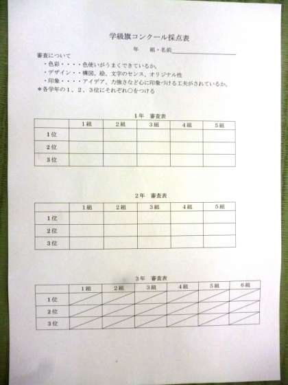 本日放課後、先生方と各学年の学級委員で投票を行いました。どの学級旗もすばらしく、選ぶのにとても苦労していました。体育大会の開会式でなびく学級旗を楽しみにしていてください。