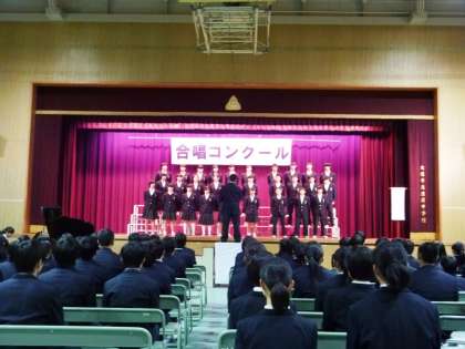 12月8日(金)5限目合唱コンクールを実施し、課題曲「Tomorrow」、自由曲2組「生きている証」6組「きみにとどけよう」1組「あなたに会えて」5組「HEIWAの鐘」4組「この地球のどこかで」3組「今を生きる」(発表順)を歌いました。少ない練習時間の中の取り組みでしたが、各クラスのすばらしい歌声が体育館に響きました。来校いただいた保護者のみなさま、ありがとうございました。