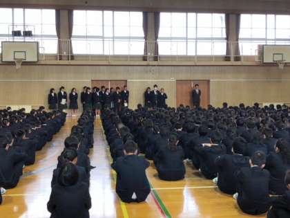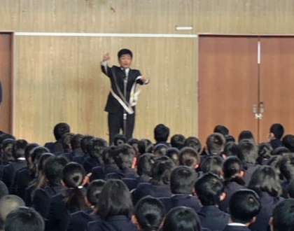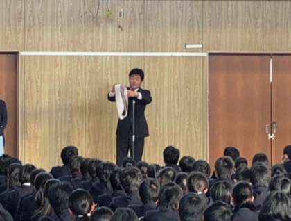 12月11日(月)の全校朝礼で、メビウスの帯の実験を見ました。180°ねじられた帯の中央または1/3のところで切っていくと、いろいろな帯になりました。不思議だなと思う心を大切にこれからも学習してほしいと思います。最後に、各委員会から今月の目標について発表しました。