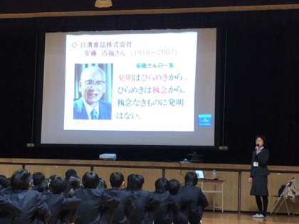 日清食品の創業者 安藤百福さんなど大阪で活躍した企業家の人生から企業家精神を学び、「あきらめない努力が大切」と教えていただきました。