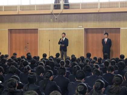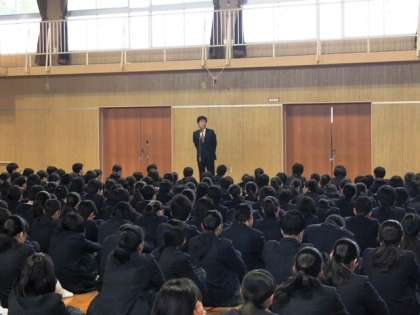 12月25日(月)2学期の終業式を実施しました。式では、校長先生より「2学期は一番長い学期で、学習面や行事面で精一杯取り組み充実した学期だったと思います。その中で、みなさんは多くの成果をだしてくれました。一方、その時々で課題も見つかったと思いますが、これからの活動に生かしてほしいと思います。また、懇談会で学習面の課題をいわれた人は、必ず冬休み中にやり直しておいてください。3年生のみなさんは、受験に向けて自分と向き合い、自分の時間を大切にしてほしいと思います。」というお話をされました。次に、生活指導担当の先生より「冬休み中の家庭でのお手伝いや交通マナーを守ること、生活リズムを乱さないようにすること」などの注意をしました。式のあと、ソフトボール部と3年生の技術家庭科作品の表彰をしました。
