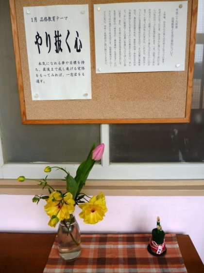 1月23日(火)午後、玄関入口と校長室前のお花を活けていただきました。玄関や廊下がきれいに彩られ、ホッとする空間になっています。いつもありがとうございます。