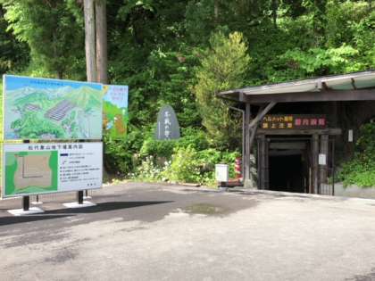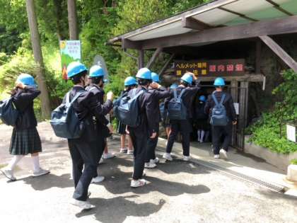 クラスが2班に分かれて、地下壕を見学します。全員が安全のためにヘルメットを着用しています。