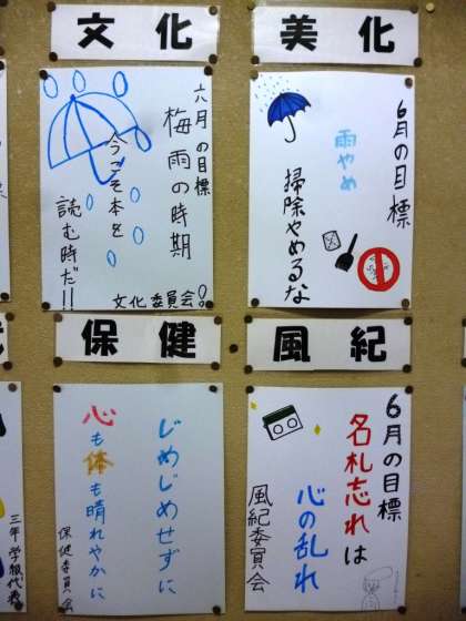 生徒会・各委員会・各学年の6月の目標です。ユーモアもあり目標に向けて頑張ろうという気にさせてくれます。