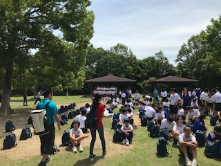 信太山青少年野外活動センターに到着しました。各クラス写真撮影を行なっています。