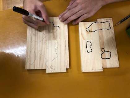 文化発表会の展示に向けて、作品づくりに取り組んでいます。今日は木工の日で、日本地図をつくっています。