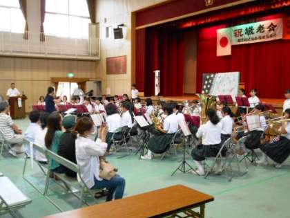 9月17日(月)敬老の日の午後、姫里小学校で姫里地域の敬老会が開催されました。敬老会第二部で本校吹奏楽部がアンコール曲を含め5曲を演奏しました。長寿のお祝いと日頃の感謝の気持ちを込めて一生懸命に演奏しました。今回、地域の方から吹奏楽部のパネルをいただきました。本当にありがとうございます。