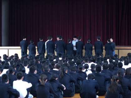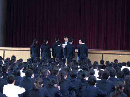 全校朝礼時に後期生徒会と委員会の認証式が行われました。