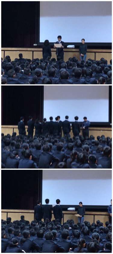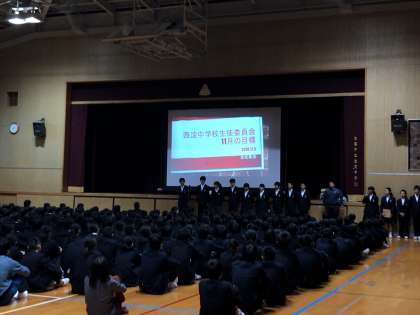 放送部、PC技術工作部、技術科の伝達表彰がありました。また、生徒会から「意識アップ作戦」の取組で、名札忘れがなかったクラスが表彰されました。