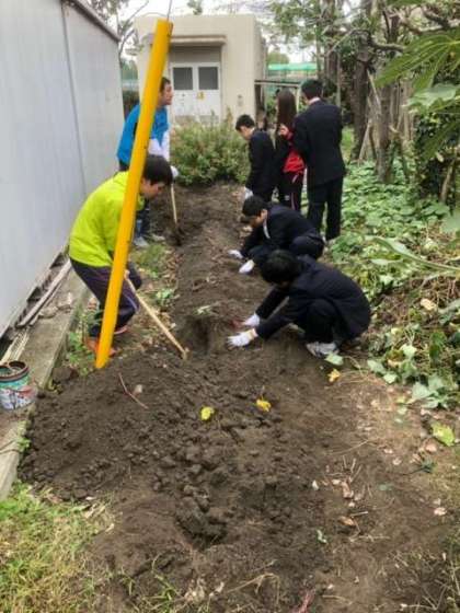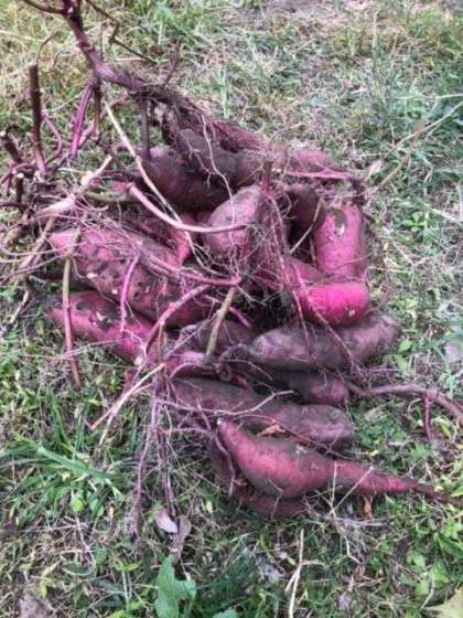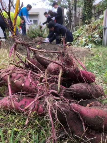 学校の畑にサツマイモが実りました。