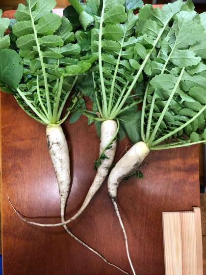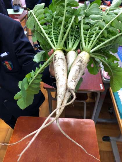 今日は生徒の皆さんが、一生懸命育ててくれた大根の収穫をしました。立派な大根ができあがり、喜びを感じています。