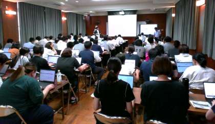 今回の研修会は、校区の3小学校との小中連携研修会を兼ねています。小学校からもたくさんの先生にお越しいただきました。探求的な学びにデジタル学習基盤はどう生かされるのかについて、夏休みの終わりに、学び合いました。