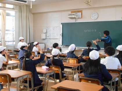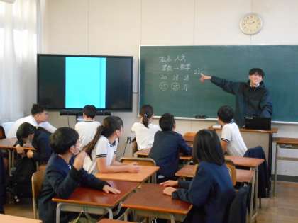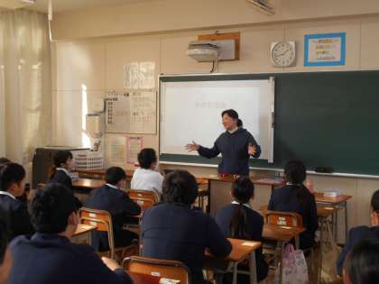 期末テストが終わり、校下小学校をお迎えしての小中交流会です。授業体験の様子です。