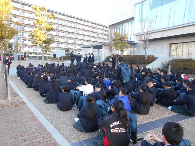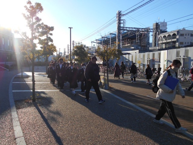 1年生校外学習の出発の様子です。少し寒いですが、元気に出発しました。