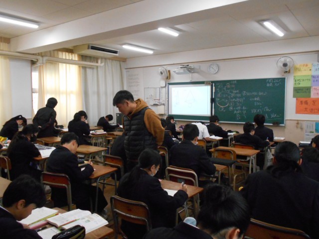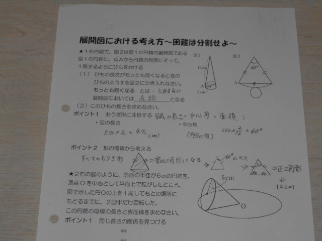 1年生の数学の授業の様子です。立体の表面積について学習しています。入試問題レベルの難問にも挑戦しています。