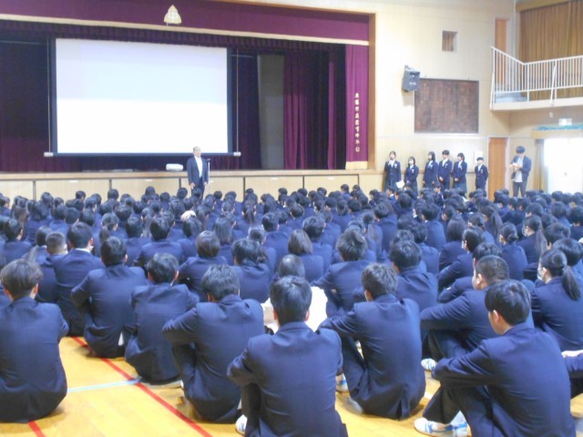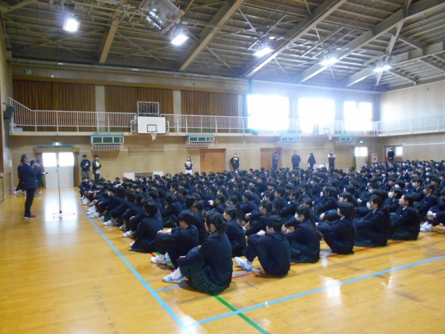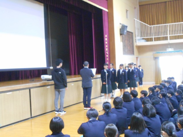 全校集会の様子です。クラブチームの教育長表彰、テニス部の表彰を行いました。その後、3月9日の生徒送別会、3月13日の卒業式に向けての話をしました。