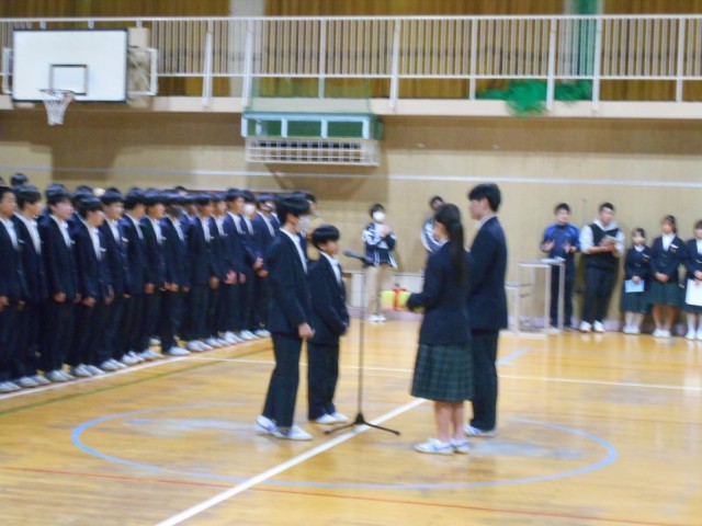 生徒送別式の様子です。在校生から、お別れの言葉と記念品の贈呈です。