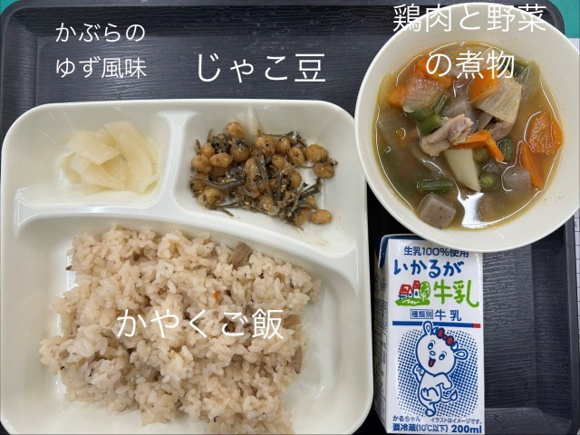 本日の給食かやくご飯・・・ほのかな甘みがあり、にんじんなどが入ったバランスのよい...