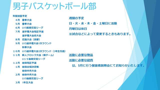 男子バスケットボール部は「誰からも応援されるチーム」を目指しています。その為に部活動だけでなく、学校活動全体も大切にしています。部活動を通して人間性を高め、仲間と協働し、バスケットボールを楽しみ、日々頑張っています。