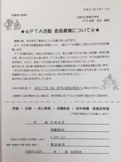 子供さんを通じて 「★☆PTA活動 委員募集について☆★」を配付させていたいただきました。
