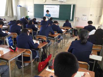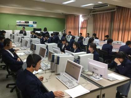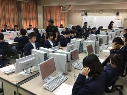写真はパソコン教室での英語の話すこと調査説明時の様子です。下の写真は生徒質問紙調査回答時の写真です。