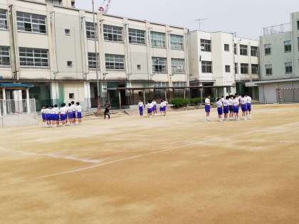 グラウンドで2年生の体育の授業が行われています。班で分かれて教え合って集団行動の練習をしています。