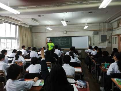 1年生で技術の授業が行われています。金属加工の学習で、身近な金属についてみんなで考えています。元気よく手を上げていました。