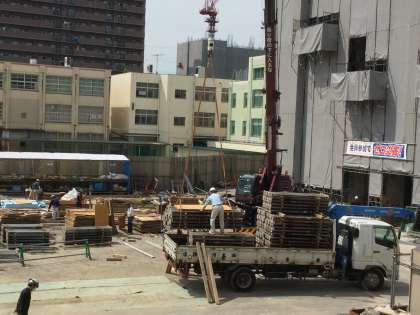 これで躯体工事の大半が終わり、内装中心の工事と変わり、電気や給排水等の設備も急ピッチで行われています。今日は型枠の解体作業が行われており、クレーン車で大量の資材が地上に降ろされ、すぐにトラックで運ばれて行きました。