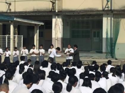 本日、全校集会にて前期生徒会各種委員会の認証式が行われ、代表生徒が認証状を受け取りました。