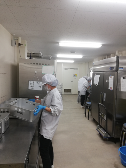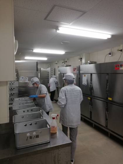 毎日、給食の衛生管理のため、食缶の消毒や配膳室の掃除など、衛生面で気を配っていただいています。