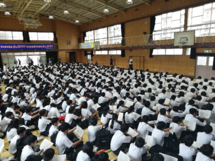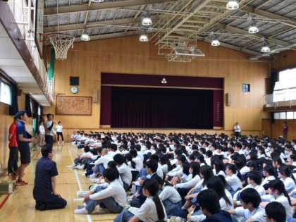 体育館に、656人(全校生徒の79%)の部員が集まり、熱心に先生の話に耳を傾けていました。