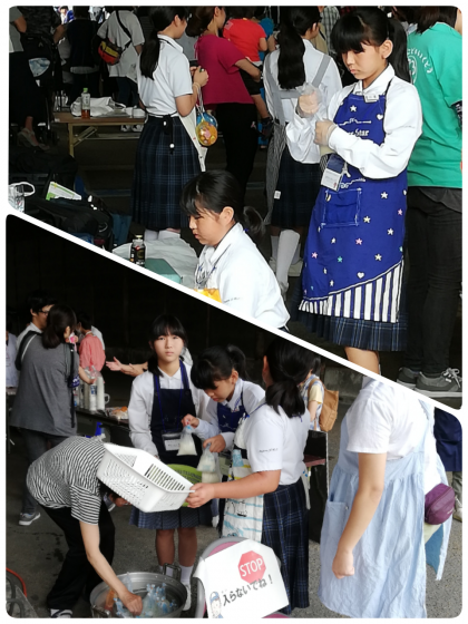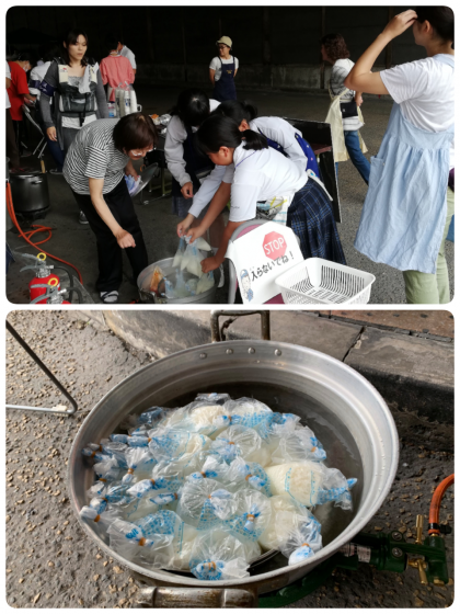 魔法の袋(災害救助用炊飯袋)に、入れたお米を沸騰したお湯につけると、ご飯が炊けます。