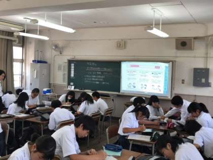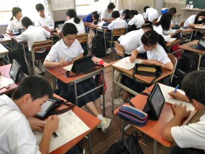 本日、2年生では職場体験学習に向けて、キャリア教育を行っています。自分が興味ある職種について、タブレットを使用して調べ学習を行っています。