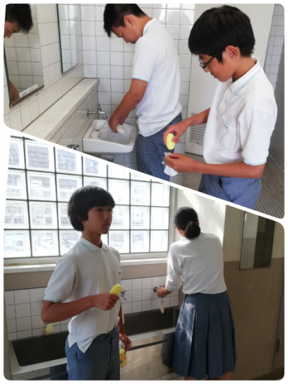 保健委員会の3年生が、1号館のトイレや手洗いのレモン石鹸を入れ替えていました。