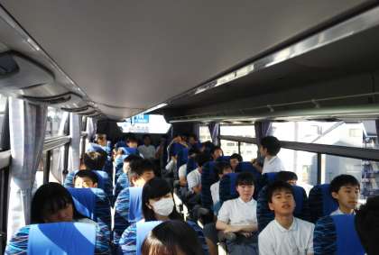 バスは予定どおりに発車しました。車内では、バスガイドさんの自己紹介のあと、レクリェーション係の生徒が明日の夜のレクリェーション大会の出場者を決めています。
