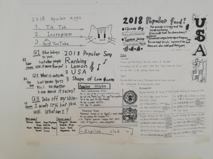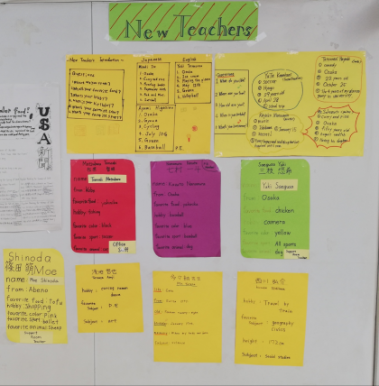 職員室並びの休養室の壁に、英語部の生徒が作成した「New Teachers」と「USA新聞」が、掲示してあります。