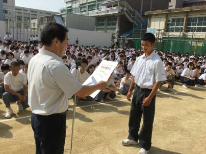 部活動表彰では、7月7日に万博記念競技場で行われた、第65回全日本中学校通信陸上競技大会大阪大会での表彰でした。
