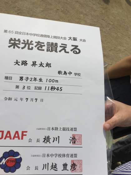 陸上部の大路昇太郎君が、男子2年生100mで11秒45の記録で第3位となり、近畿大会への出場が決まりました。