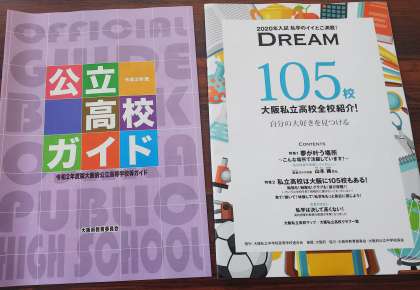 本日3年生の生徒に二種類のガイドブックを配付しました。写真左の公立高校のガイドは大阪府教育委員会発行、右の私立高校のガイドは大阪府私立中学校高等学校連合会発行です。