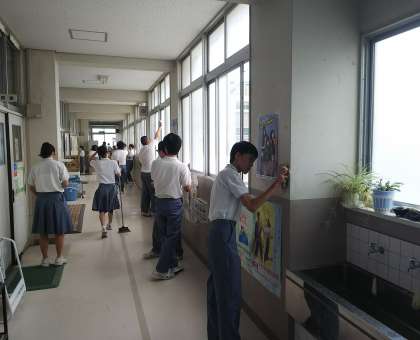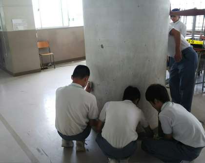 写真は、本館2階廊下のピロティ、廊下の壁の汚れを落としているところです。