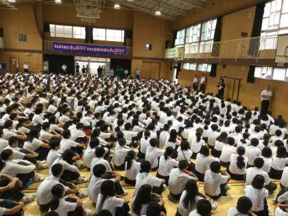 7月19日(金)に2019年度1学期の終業式を行いました。体育館に全校生徒が一堂に会しての初めての式でした。フロアー全面が生徒で埋まった状態になりましたが、全員がクラスごとにきれいに整列できていました。