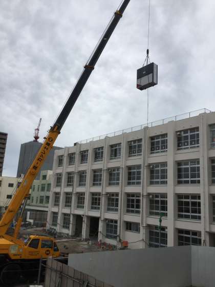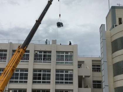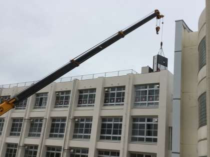 4号館から移設された室外機、新たに運ばれてきた室外機とたくさんの機器が、終日クレーン車で屋上に運ばれて行きました。