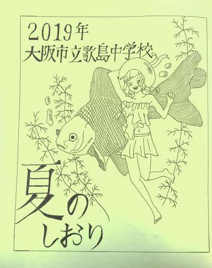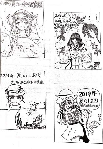 表紙、裏表紙、中表紙は「金魚と麦わら帽子」をテーマに生徒が生徒の皆さんに書いてもらった絵です。