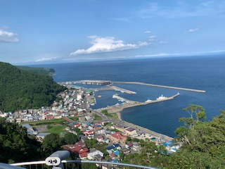ここから国後島がよく見えます。国後島は沖縄と同じくらいの大きさがあるので、全部が見えません。北方領土の中で最も多くロシア人が住んでいる島です。