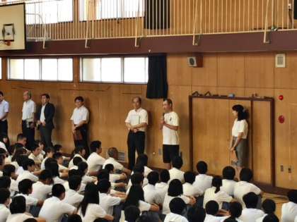 本日から2学期がスタートしました。学級でのあいさつの後、全校生徒が体育館に集い、始業式が行われました。
