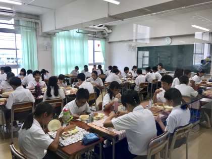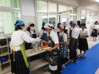 昨日から、全校生徒による給食がスタートしました。初日ははじめての準備に戸惑いながらも協力して準備を進めることができました。