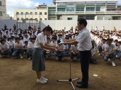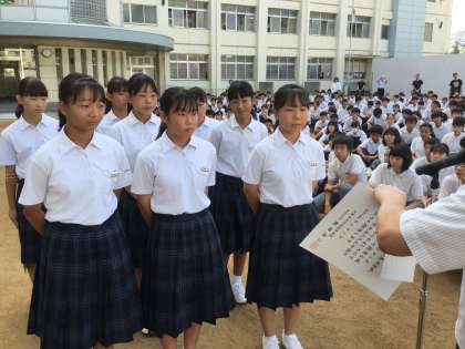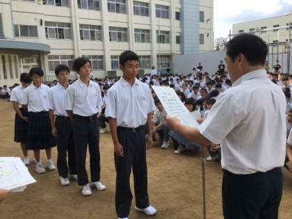 全校集会に先立って、校長先生より夏季休業中に表彰を受けた水泳、陸上、女子テニスの表彰伝達を行いました。各部活動とも複数枚の表彰でした。