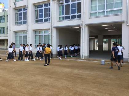 写真は学年ごとにグラウンドから教室へ向かっている様子です。